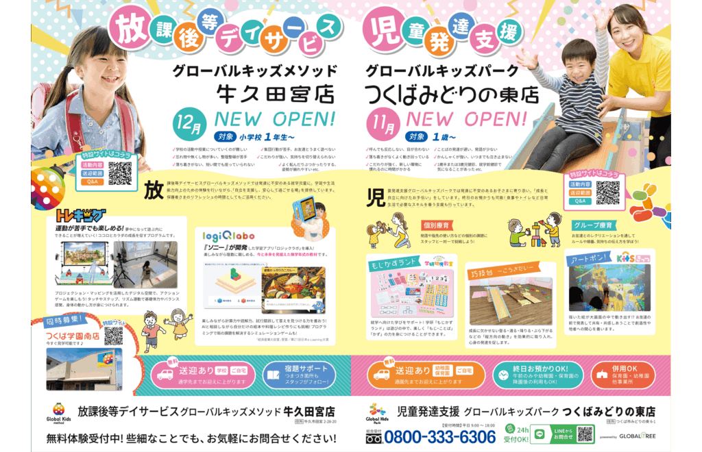 1歳〜を対象とした「児童発達支援・グローバルキッズパークつくばみどりの東店」では、個別療育、グループ療育を通じてあらゆる面からアプローチを実施し、お子さまの成長をサポートいたします。