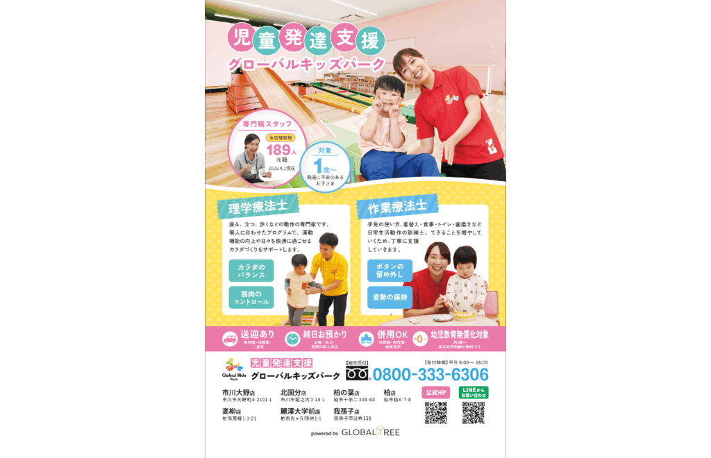 2025.10.03 ままここっと – 千葉北西部版 「ままここっと-ちば北西部版」へ、弊社事業所が紹介されました。 TOP Media 「ままここっと-ちば北西部版」へ、弊社事業所が紹介されました。 ▪2025年秋号・ちば北西部版療育の専門職スタッフがグループ全体で189名在籍。理学療法士や作業療法士がお子さまの課題に合わせたアプローチを実施いたします。1歳〜対象の「児童発達支援・グローバルキッズパーク」が紹介されました。