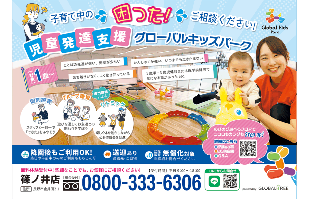 長野県長野市にある、1歳〜対象の「児童発達支援・グローバルキッズパーク篠ノ井店」が紹介されました。