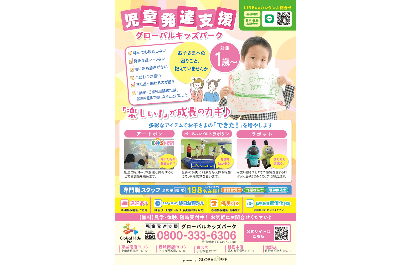 2025.10.31 ママトコドモト -県南版 栃木発「ママトコドモト -県南版」へ、弊社事業所が紹介されました。 TOP Media 栃木発「ママトコドモト -県南版」へ、弊社事業所が紹介されました。 ▪2025年11月号・県南版多彩なアイテムでお子さまの「できた!」を促すサポートを実施いたします。1歳〜対象の「児童発達支援・グローバルキッズパーク」が紹介されました。
