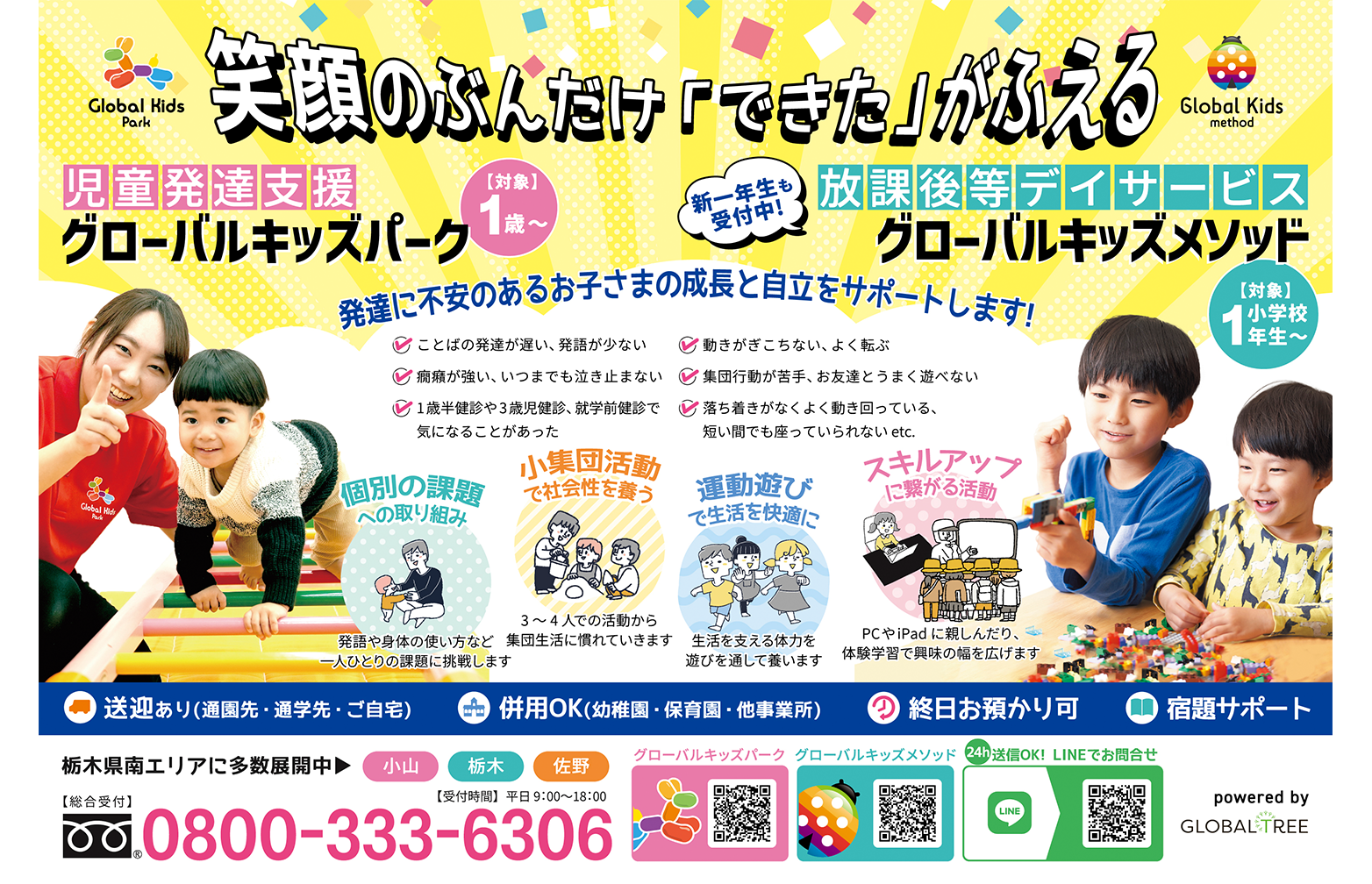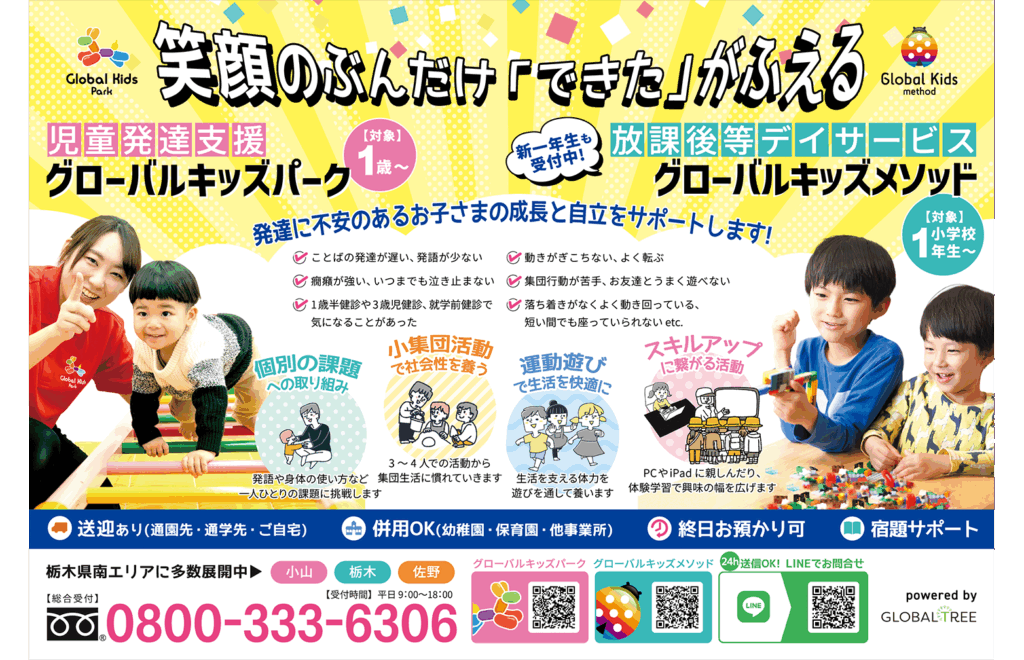 2025.11.28 ママトコドモト -県南版 栃木発「ママトコドモト -県南版」へ、弊社事業所が紹介されました。 TOP Media 栃木発「ママトコドモト -県南版」へ、弊社事業所が紹介されました。 ▪2025年12月号・県南版お子さま一人ひとりに合わせた療育を実施して、健やかな成長を促します。1歳〜対象の「児童発達支援・グローバルキッズパーク」、小学校1年生〜対象の「放課後等デイサービス・グローバルキッズメソッド」が紹介されました。