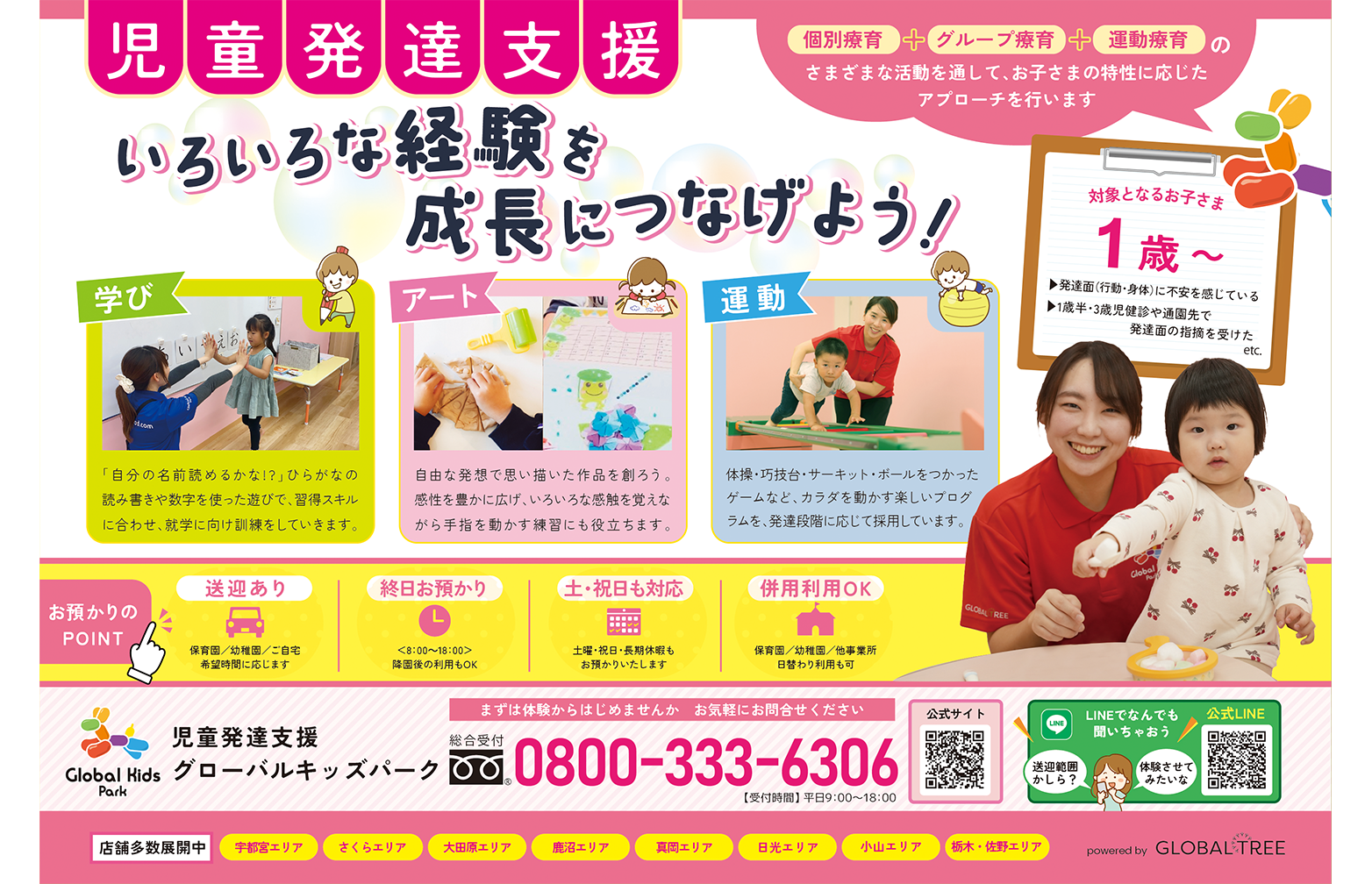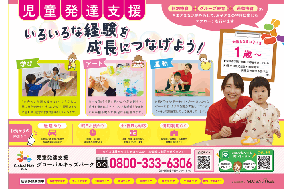 2025.09.26 ママトコドモト -県央版 栃木発「ママトコドモト -県央版」へ、弊社事業所が紹介されました。 TOP Media 栃木発「ママトコドモト -県央版」へ、弊社事業所が紹介されました。 ▪2025年10月号・県央版多彩な療育を実施して、多方面からお子さまの成長へアプローチいたします。1歳〜対象の「児童発達支援・グローバルキッズパーク」が紹介されました。