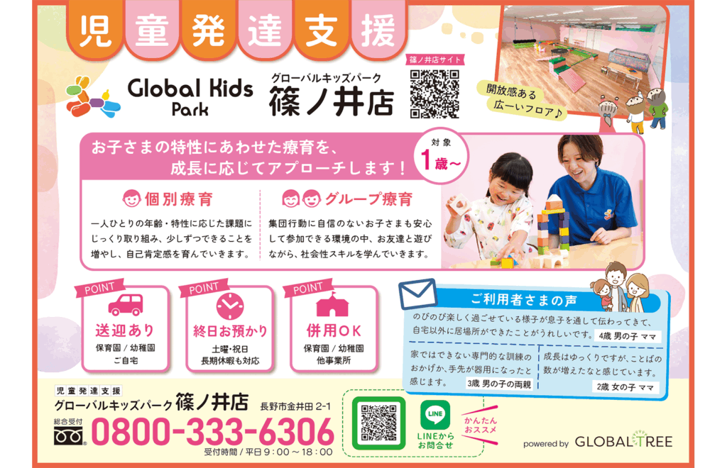 2025.08.26 月刊モナミ 長野のフリーペーパー「月刊モナミ」へ、弊社事業所が紹介されました。 TOP Media 長野のフリーペーパー「月刊モナミ」へ、弊社事業所が紹介されました。 ▪2025年9月号お子さま一人ひとりの個性や成長に合わせた療育を実施して、「できた!」を増やします。長野県長野市にある、1歳〜対象の「児童発達支援・グローバルキッズパーク篠ノ井店」が紹介されました。