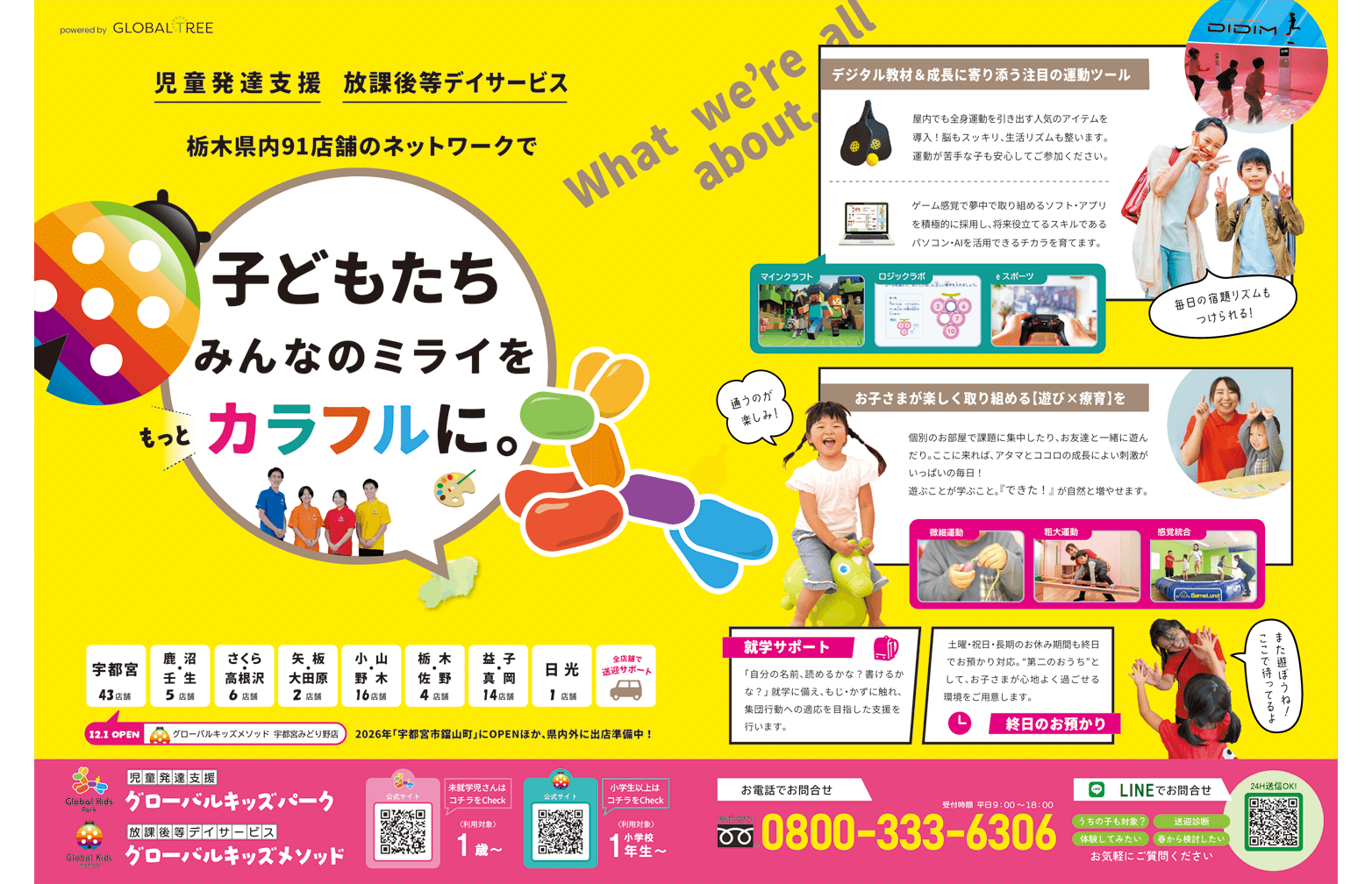 2025.11.25 monmiya-もんみや 「monmiya(もんみや)」へ、弊社事業所が紹介されました。 TOP Media 「monmiya(もんみや)」へ、弊社事業所が紹介されました。 ▪2025年12月号栃木県内91店舗を展開し、子どもたちの未来をサポート。1歳〜対象の「児童発達支援・グローバルキッズパーク」、小学校1年生〜対象の「放課後等デイサービス・グローバルキッズメソッド」が紹介されました。