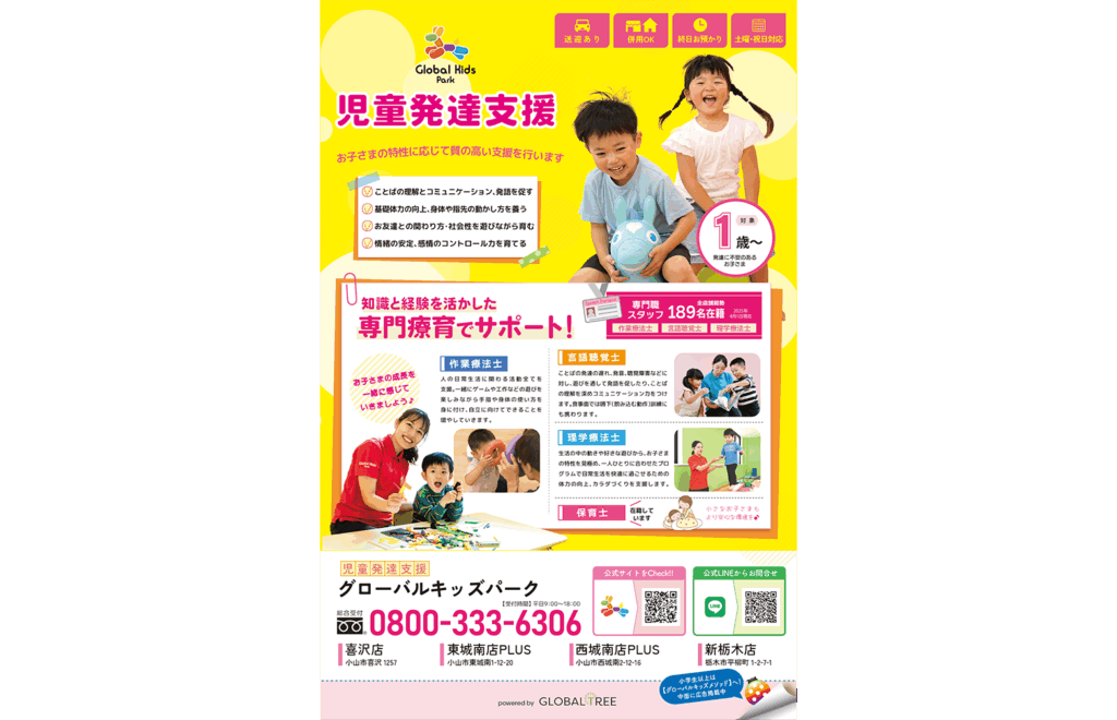 2025.11.26 月刊おりっぷ 小山みっちゃく生活情報誌「月刊-おりっぷ」へ、弊社事業所が紹介されました。 TOP Media 小山みっちゃく生活情報誌「月刊-おりっぷ」へ、弊社事業所が紹介されました。 ▪2025年12月号成長と自立を促す、充実の活動プログラムを実施。小学校1年生〜対象の「放課後等デイサービス・グローバルキッズメソッド」が紹介されました。 療育の専門職スタッフがグループ全体で189名在籍。理学療法士や作業療法士がお子さまの課題に合わせたアプローチを実施いたします。1歳〜対象の「児童発達支援・グローバルキッズパーク」が紹介されました。