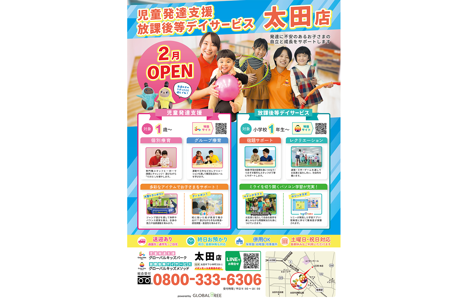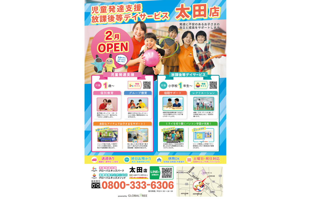 1歳〜対象の「児童発達支援・グローバルキッズパーク太田店」、小学校1年生〜対象の「放課後等デイサービス・グローバルキッズメソッド太田店」が紹介されました。