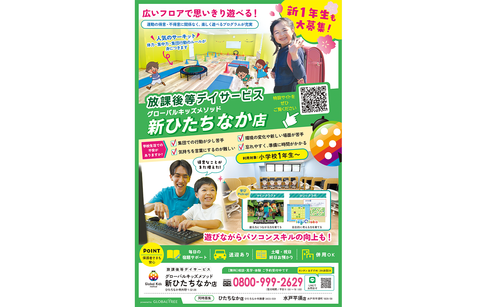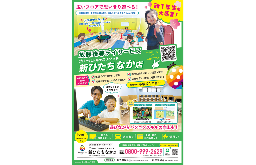 2026.03.02 月刊サクラサクライフ フリーペーパー『月刊サクラサクライフ』へ、弊社事業所が紹介されました。 TOP Media フリーペーパー『月刊サクラサクライフ』へ、弊社事業所が紹介されました。 ▪2026年3月号のびのび遊べる広いフロアを活用した活動や、パソコンを使用した活動を実施し、お子さまの成長を促します。小学校1年生〜対象の「放課後等デイサービス・グローバルキッズメソッド新ひたちなか店」が紹介されました。