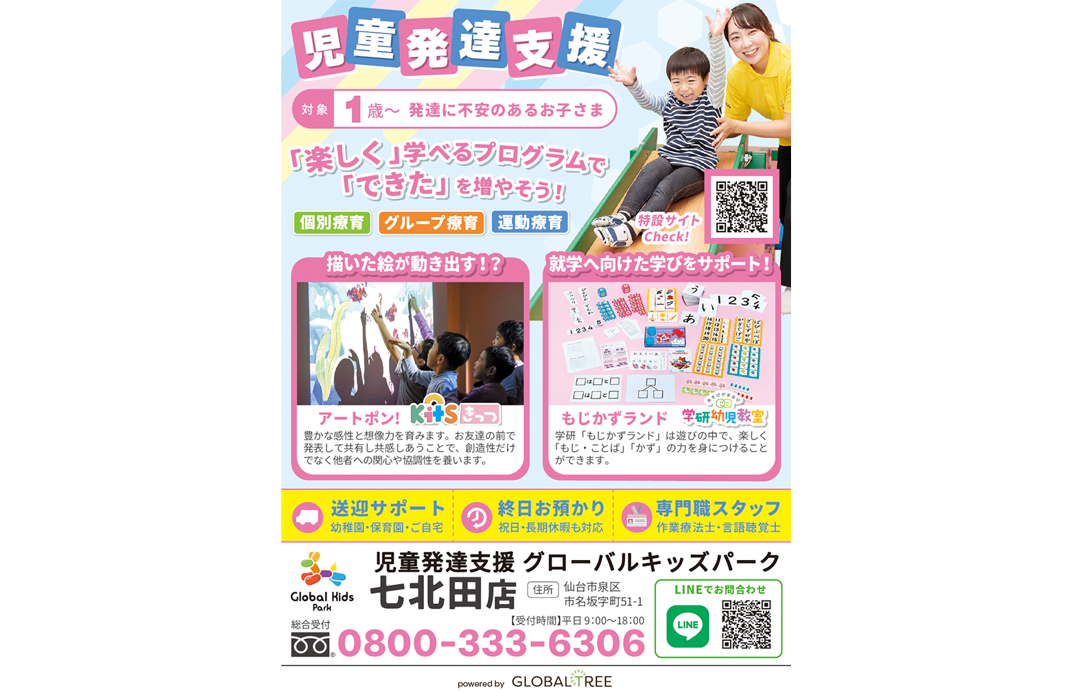 2025.07.31 とみぃず! 「とみぃず!」へ、弊社事業所が紹介されました。 TOP Media 「とみぃず!」へ、弊社事業所が紹介されました。 ▪2025年8月号お子さまの成長をサポートする、楽しい療育プログラムが充実しています。宮城県仙台市にある、1歳〜対象の「児童発達支援・グローバルキッズパーク七北田店」が紹介されました。
